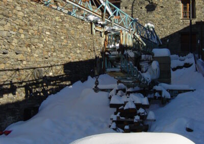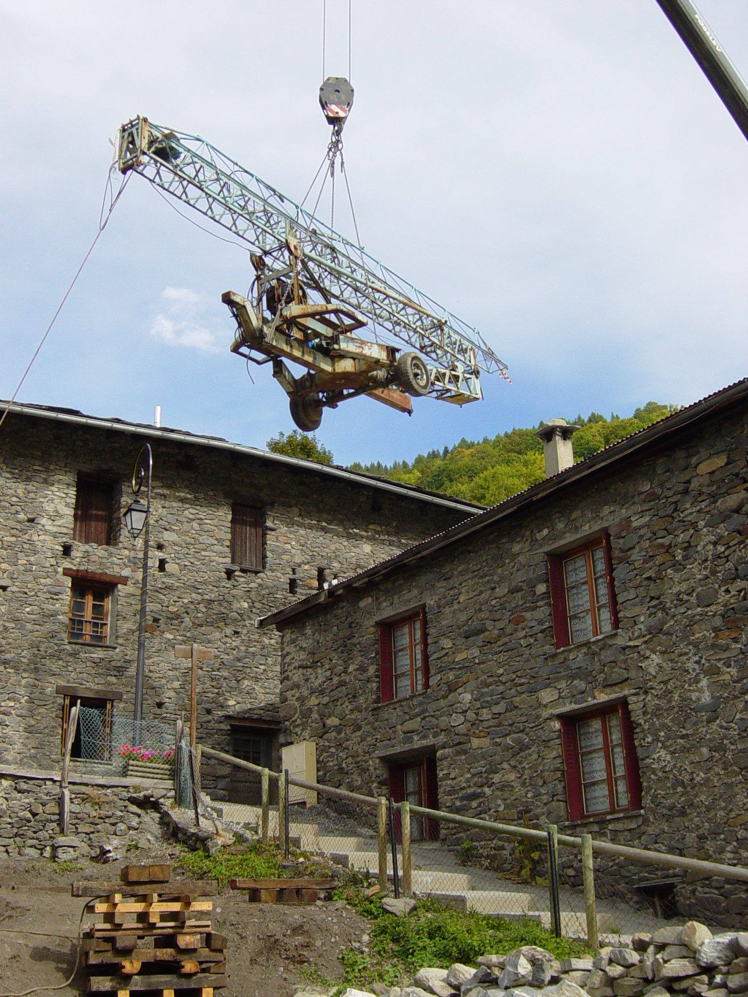 Nous avons commencé par installer une grue : comme elle ne passait pas dans la rue du village, nous l’avons faite passer au dessus des autres maisons portée par un camion grue!