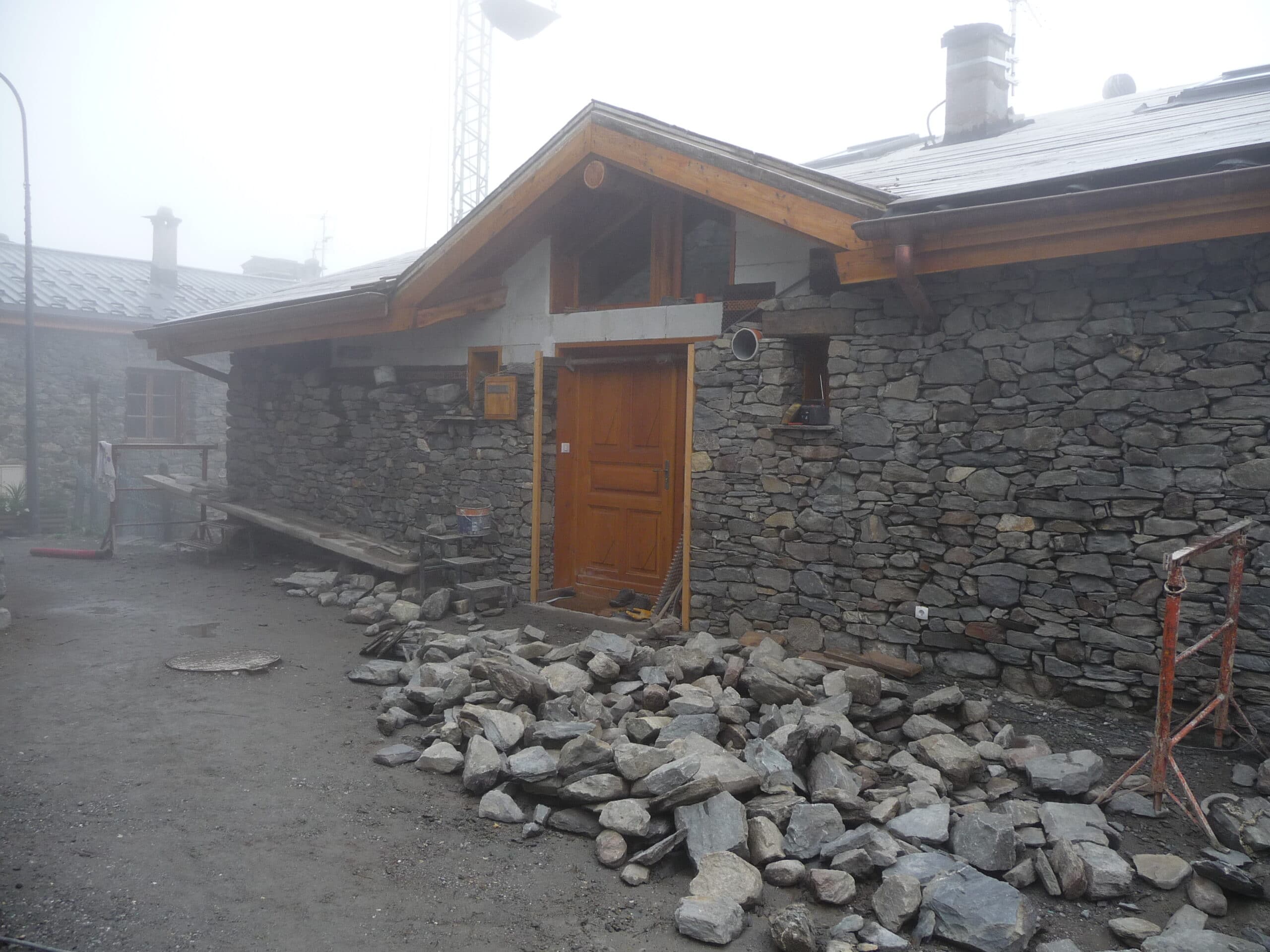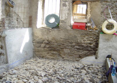 Ensuite nous avons coulé les dalles du rez de jardin et du 1er étage puis nous avons « tombé » et remonté les murs l’un après l’autre. Puis nous avons rhabillé les façades en pierres (celles des murs intérieurs et extérieurs!).