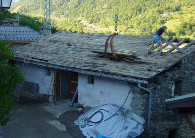 Dernière partie : avec des murs solides nous avons pu enlever le toit et en remettre un tout neuf, en lauzes traditionnelles bien évidemment!